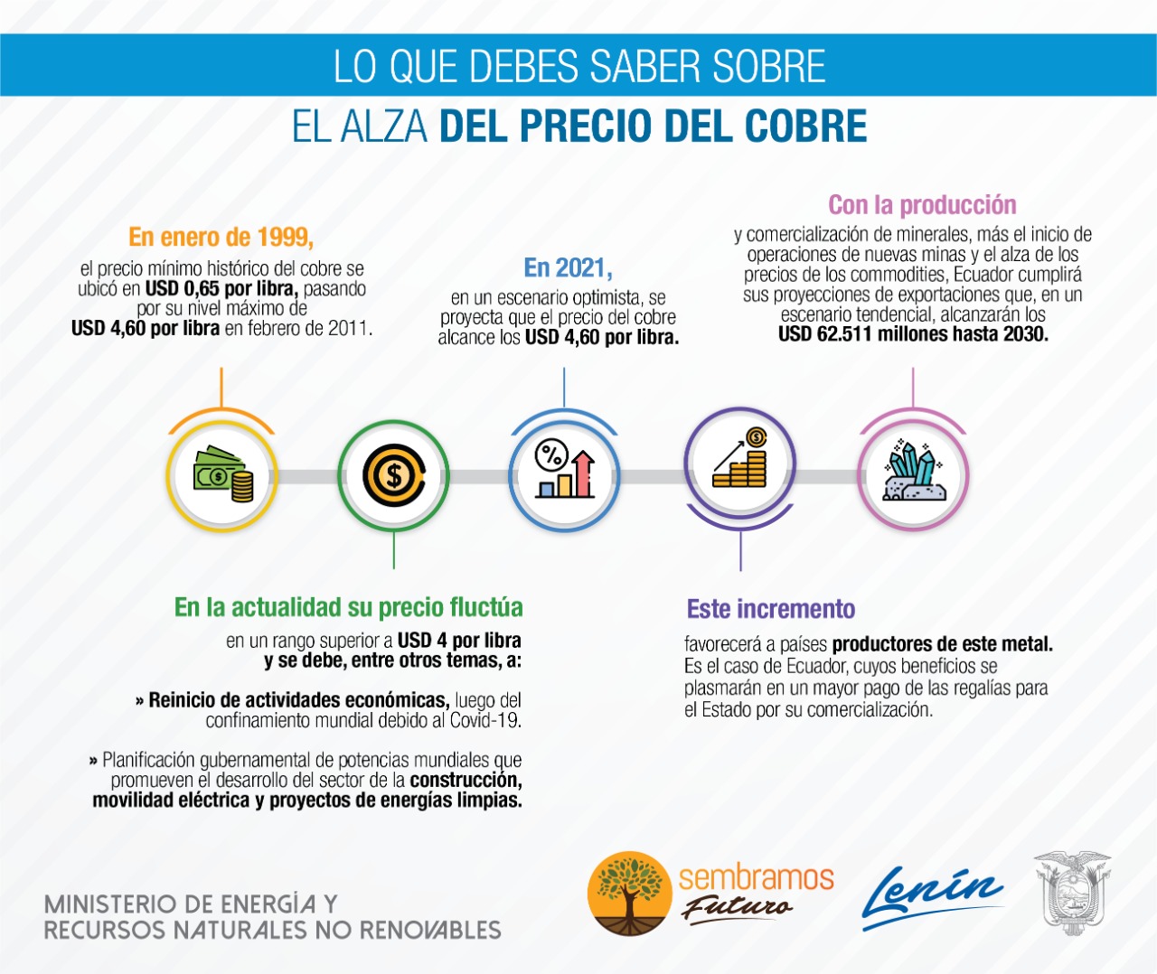 Tomando en cuenta estos factores y según las estimaciones del Ministerio de Energía y Recursos Naturales No Renovables, se proyectan tres escenarios del precio promedio del cobre para el año 2021: