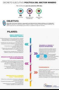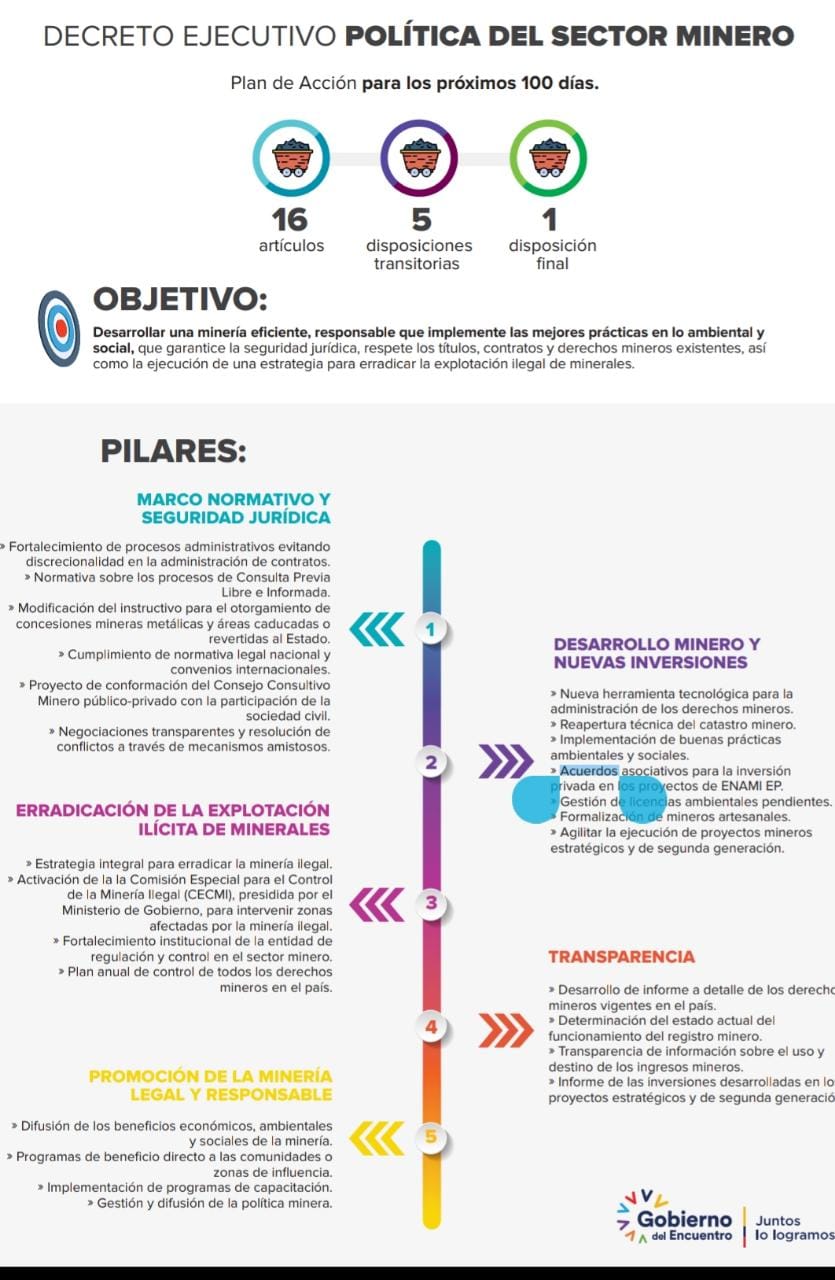 De acuerdo con la disposición presidencial, el Ministerio de Energía y Recursos Naturales No Renovables, dentro de los próximos 100 días, deberá difundir de manera transparente las condiciones en que la minería legal y responsable debe desarrollarse en el país e impulsar la generación de normativa sobre los procesos de consulta previa, libre e informada a los pueblos y nacionalidades indígenas para los casos en que las decisiones o autorizaciones gubernamentales puedan influir en sus territorios, conforme a los lineamientos determinados por la Corte Constitucional del Ecuador. También se implementará un plan de formalización para mineros artesanales, entre otros aspectos relacionados con la industria.