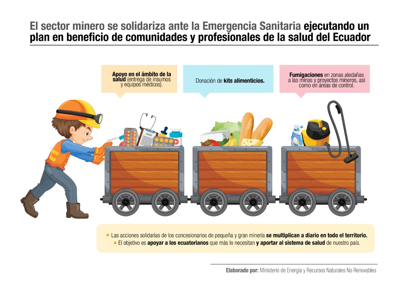 El sector minero ecuatoriano, a través de las empresas que mantienen concesiones en el país, ha emprendido acciones para apoyar a los gobiernos autónomos descentralizados, a los COE provinciales y cantonales; y a las zonas de influencia de las minas y proyectos exploratorios, durante la Emergencia Sanitaria que enfrenta el país por la propagación del Covid -19.