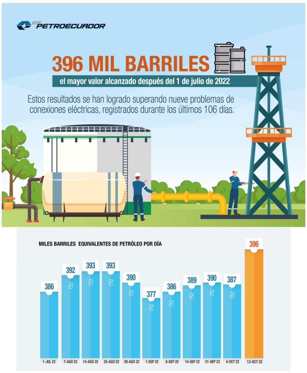 EP Petroecuador alcanzó este 13 de octubre un pico máximo de producción de 396 mil barriles equivalentes de petróleo por día (beppd), el mayor valor alcanzado después del 1 de julio pasado, tras la Fuerza Mayor declarada en la empresa, debido a la paralización nacional registrada en junio de este año. Con ello, se restituyó la producción, logrando estabilizarse y con tendencia al alza.