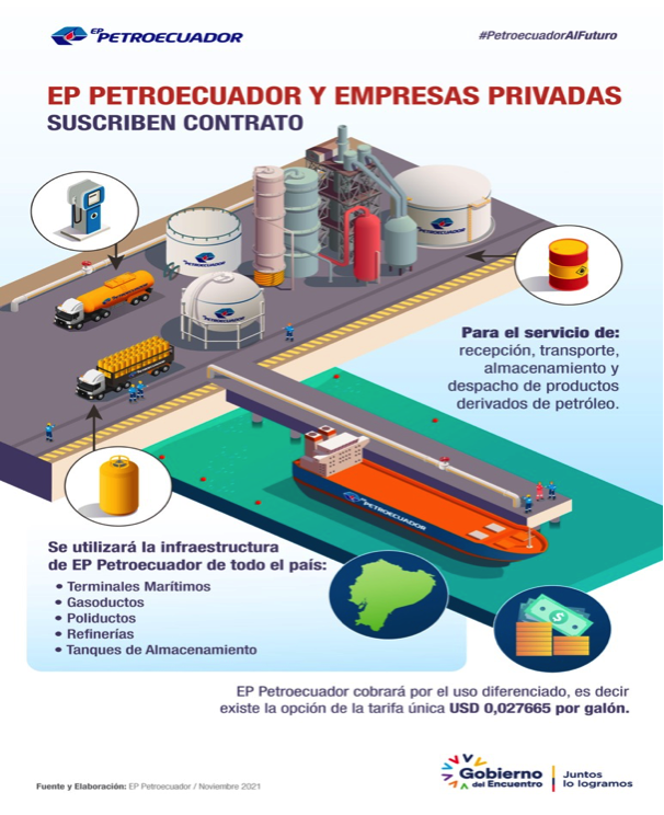Es la primera vez que EP Petroecuador firma un convenio de estas características con la empresa privada, que permitirá optimizar los recursos existentes a través de la utilización de la infraestructura de la estatal petrolera, tal como lo establece el Decreto Ejecutivo 1158, cuya Disposición General Cuarta señala que “las empresas públicas deberán facilitar la infraestructura a cambio del pago de una tarifa razonable por volumen y permanencia, para la importación, recepción transporte y almacenamiento, y despacho de combustibles, con su costo y margen. La tarifa será establecida por la Agencia de Regulación y Control de Energía y Recursos Naturales No Renovables”.