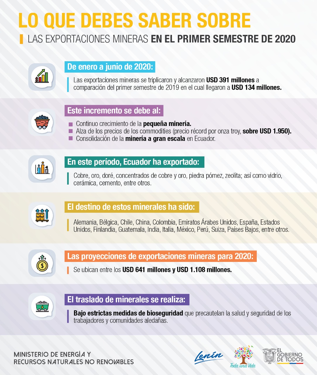 De enero a junio de 2020, Ecuador exportó alrededor de USD 391 millones en minerales, tres veces más que en el primer semestre del 2019, periodo en el cual las exportaciones mineras llegaron a los USD 134 millones.