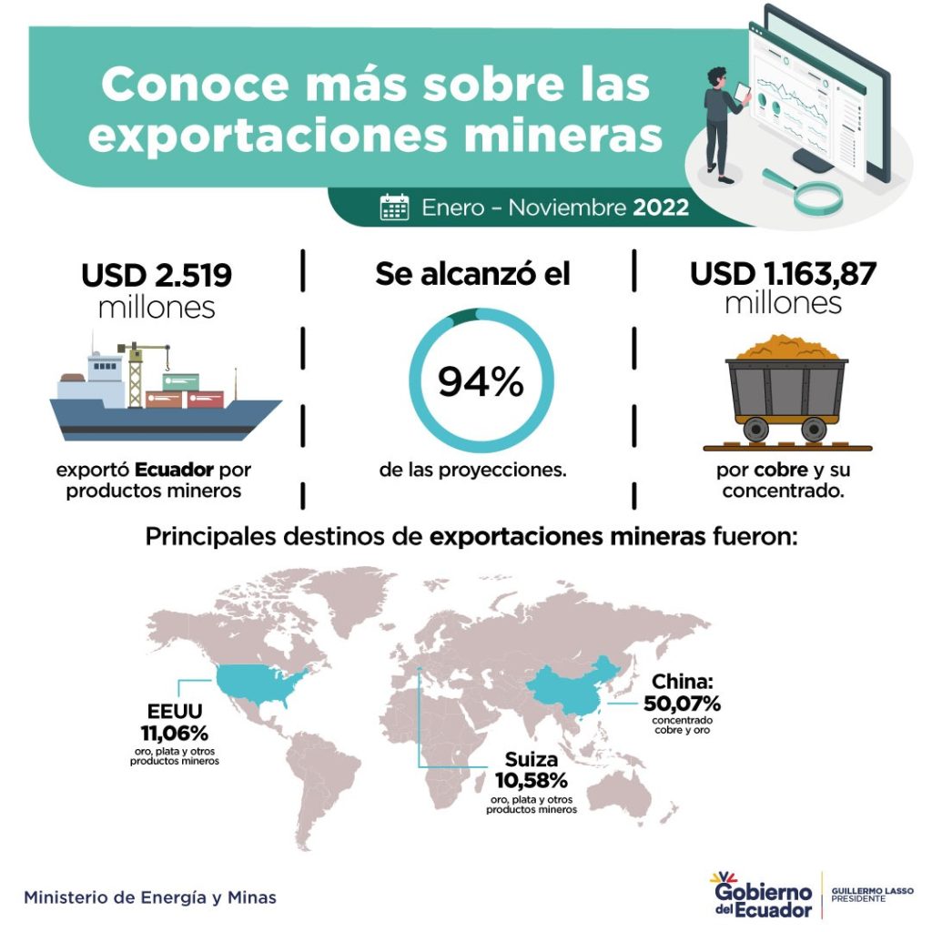 De acuerdo con la última publicación del Banco Central del Ecuador – BCE- las exportaciones de productos mineros con corte a noviembre de 2022, alcanzaron USD 2.519,20 millones, lo que representa el 94% de la meta para ese año y que sigue ubicando al sector, como el cuarto rubro de exportaciones nacionales, tercer rubro de exportaciones no petroleras y primer rubro de exportaciones no tradicionales.