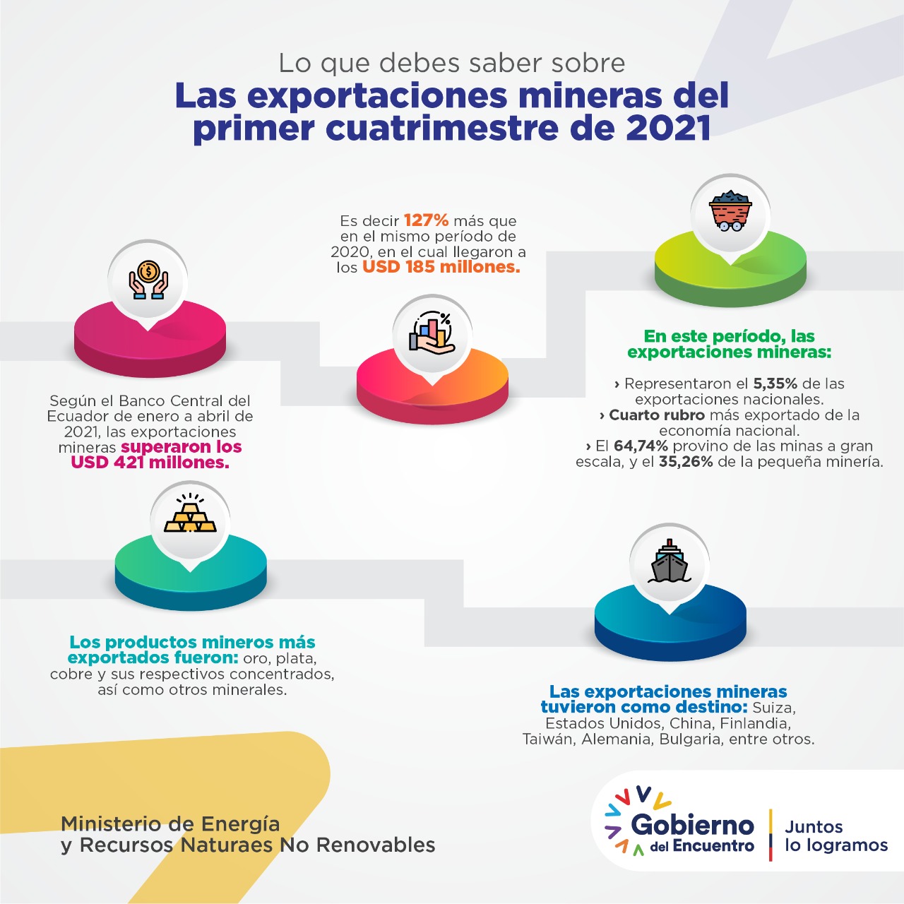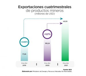Entre enero y abril de 2021, las exportaciones mineras superaron los USD 421 millones, 127% más en comparación con el mismo período del 2020, en el cual alcanzaron los USD 185 millones, según el Banco Central del Ecuador (BCE).