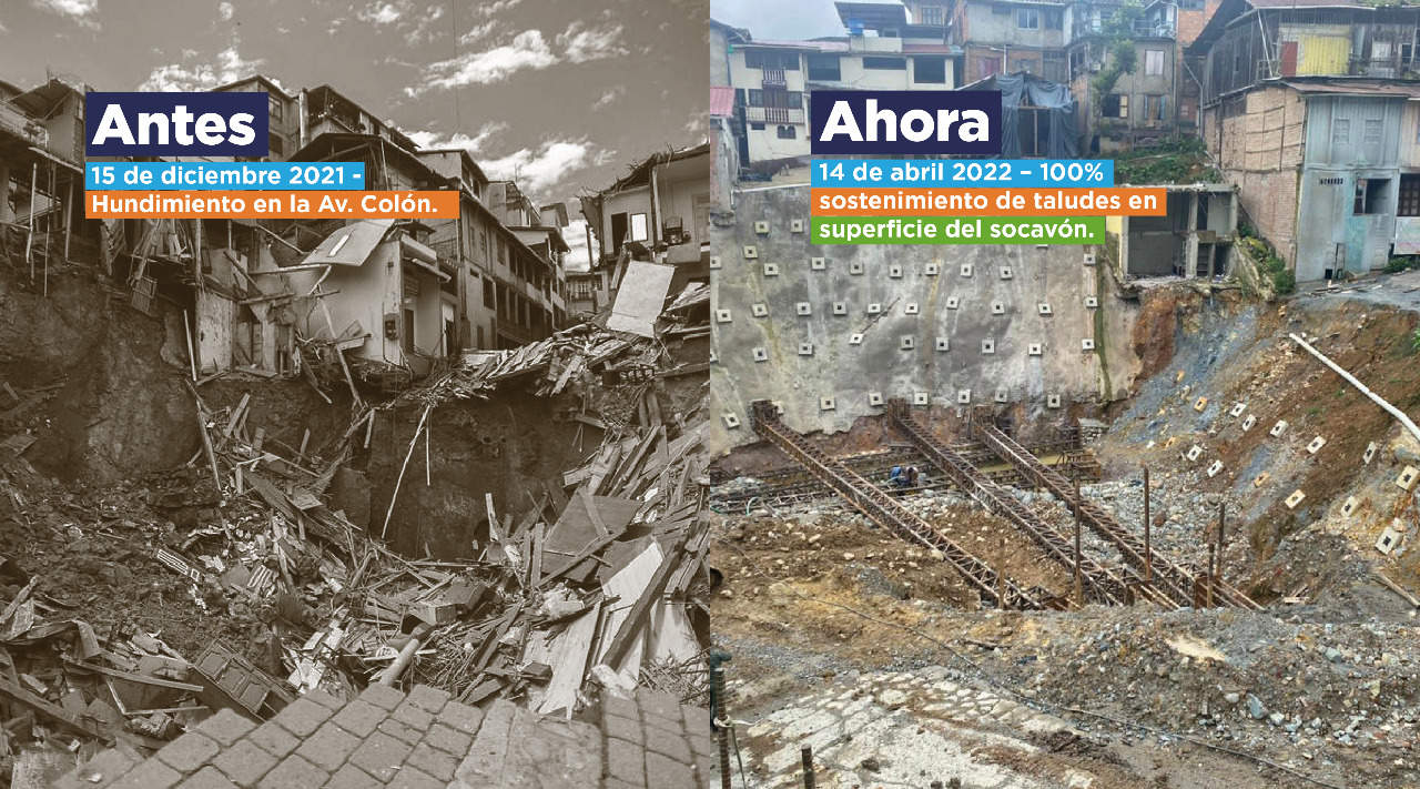 Luego de cuatro meses de intenso trabajo técnico, finalizaron las obras de sostenimiento de las paredes del socavón, acontecido el 15 de diciembre del 2021 en las calles Colón y Gonzalo Pizarro, en el cantón Zaruma, provincia de El Oro.