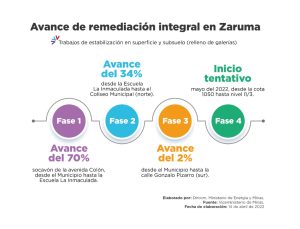 Es importante recalcar que los trabajos se realizan de forma simultánea en la superficie y en el subsuelo, para el sostenimiento de la zona y evitar futuros hundimientos. El Plan de Remediación Integral del casco urbano de la ciudad de Zaruma se ejecuta en cuatro fases y la primera culminará el próximo mes de mayo.