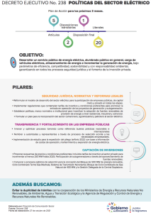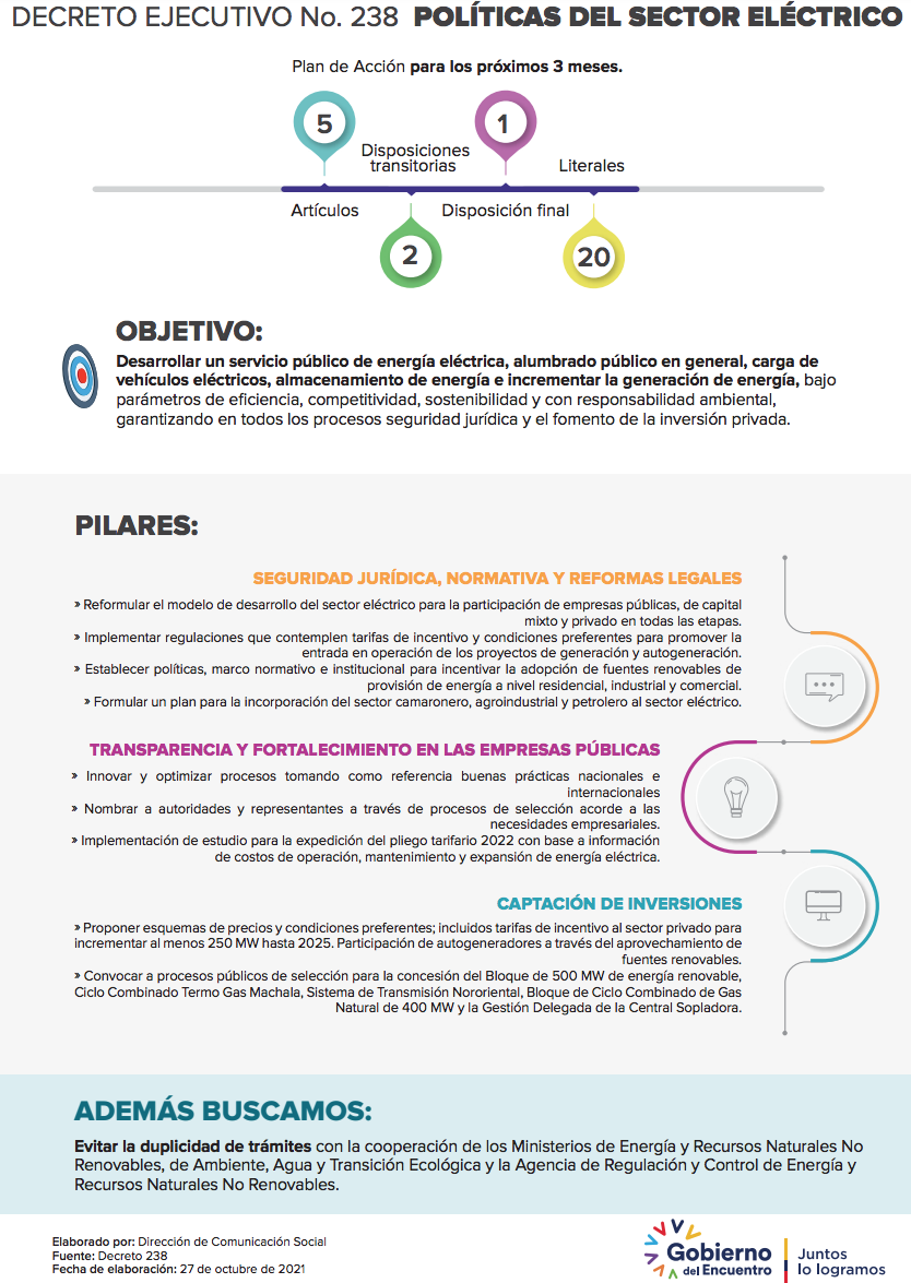 La expedición del Decreto Ejecutivo Nro. 238, el cual emite las Nuevas Políticas Eléctricas, se suma a los Dictámenes Presidenciales Nro. 95 y Nro. 151, que determinan la Política Publica Petrolera y Minera, respectivamente. Por lo cual, todos los sectores estratégicos del país cuentan con lineamientos y planes de acción concretos para su óptimo desarrollo.