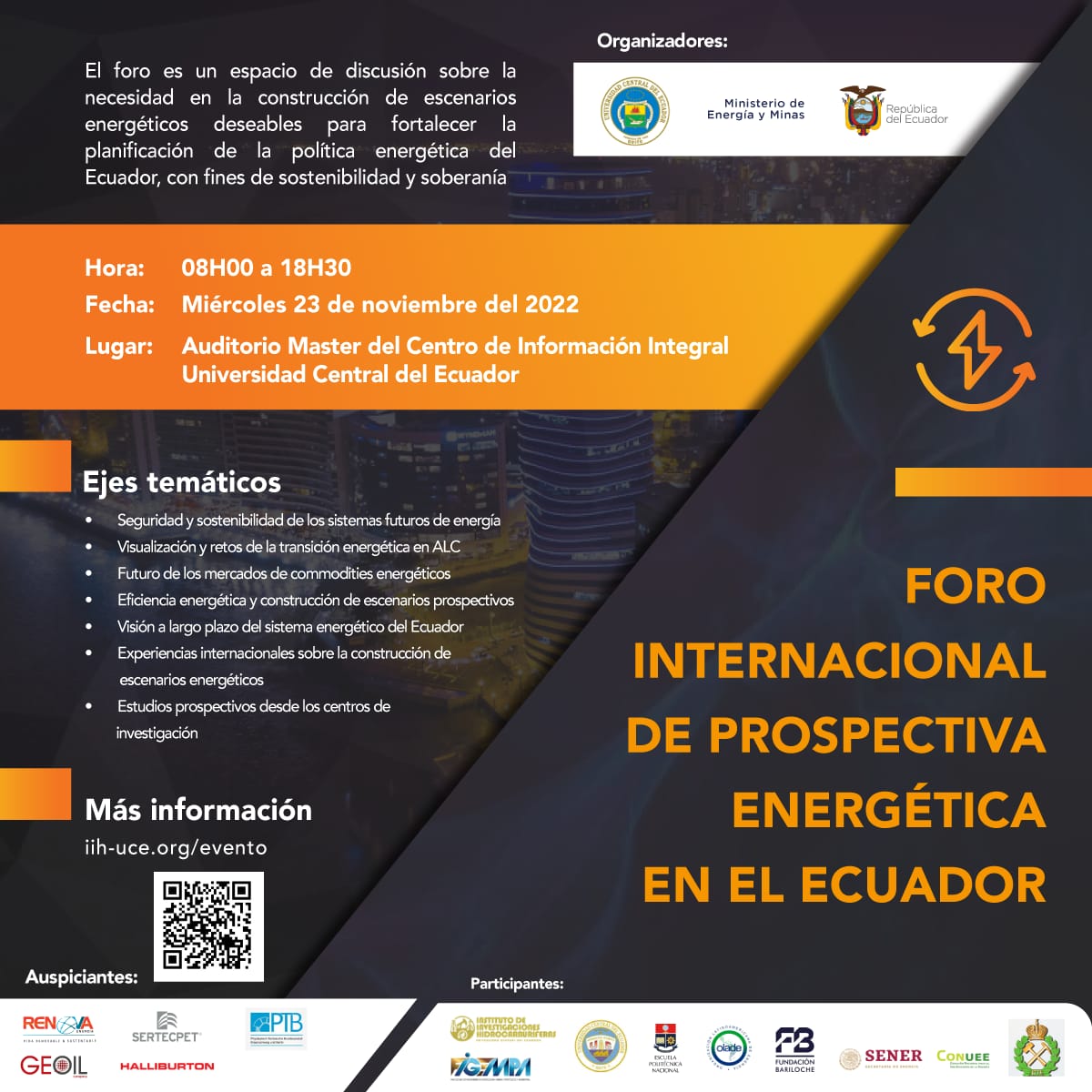 El Ministerio de Energía y Minas (MEM) en coordinación con la Universidad Central del Ecuador (UCE), llevarán a cabo el primer Foro Internacional de Prospectiva Energética en el país, el 23 de noviembre del 2022 en la ciudad de Quito. Este encuentro regional que contará con la participación de representantes de la comunidad científica, líderes gubernamentales y directivos de Organismos Internacionales, tendrá el objetivo de proporcionar un espacio de diálogo sobre la necesidad de construir escenarios energéticos nacionales deseables con base en metodologías innovadoras y experiencias internacionales, contemplando la realidad y autodeterminación en el desarrollo sostenible del país.