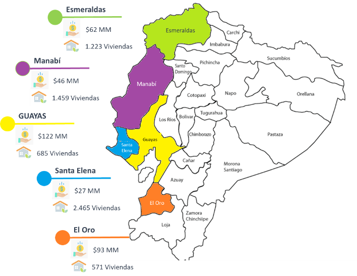 Se prevé la ejecución de 194 proyectos, distribuidos en cinco provincias, El Oro, Esmeraldas, Guayas, Manabí y Santa Elena.