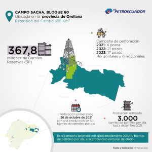 Actualmente, el campo Sacha produce más de 65.000 barriles de petróleo por día y las reservas remanentes de este campo son de 367.8 millones de barriles.Ecuador impulsa el óptimo desarrollo del sector hidrocarburífero, mediante el aprovechamiento responsable de los recursos, para optimizar los recursos estatales, captar mayor inversión, generando empleo y nuevas oportunidades para beneficio de todos los ecuatorianos.