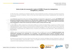 Inicia el plan de vacunación contra el COVID- 19 para los trabajadores energéticos y mineros