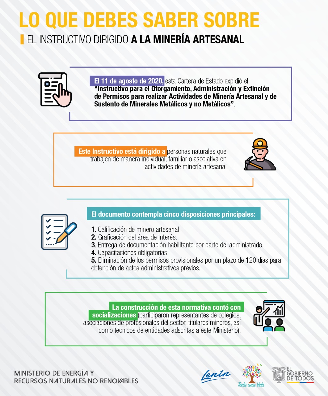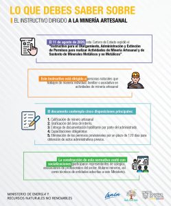 El pasado 11 de agosto de 2020, el Ministerio de Energía y Recursos Naturales No Renovables (MERNNR), a través de su Viceministerio de Minas, expidió el “Instructivo para el Otorgamiento, Administración y Extinción de Permisos para realizar Actividades de Minería Artesanal y de Sustento de Minerales Metálicos y no Metálicos”, el cual fue emitido mediante Acuerdo Ministerial Nro. MERNNR-MERNNR-2020-0045-AM.