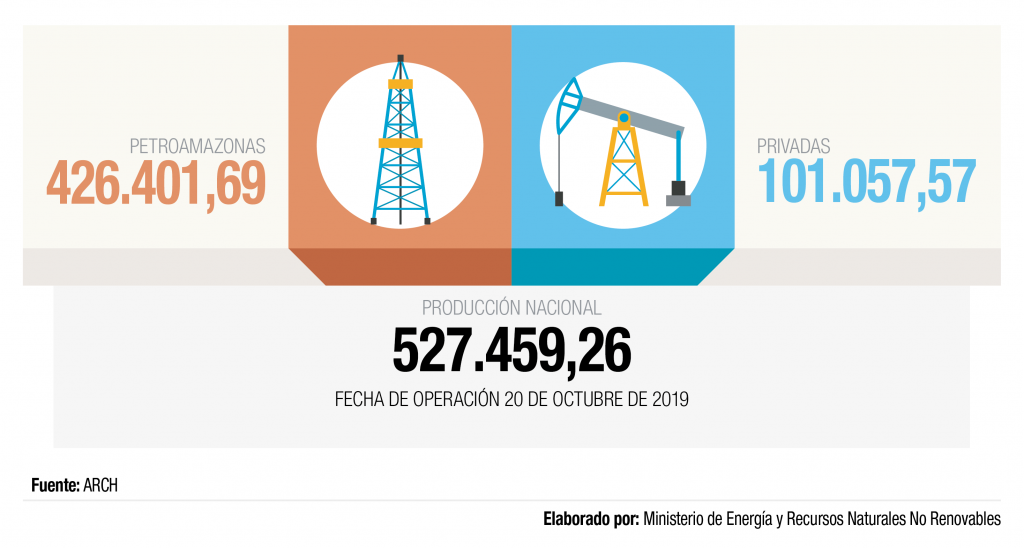 Al momento, la producción diaria de la estatal Petroamazonas EP está en 426.401 barriles y de las empresas privadas bordea los 101.057 barriles de petróleo, según el reporte de producción diaria de la Agencia de Regulación y Control Hidrocarburífero (ARCH).