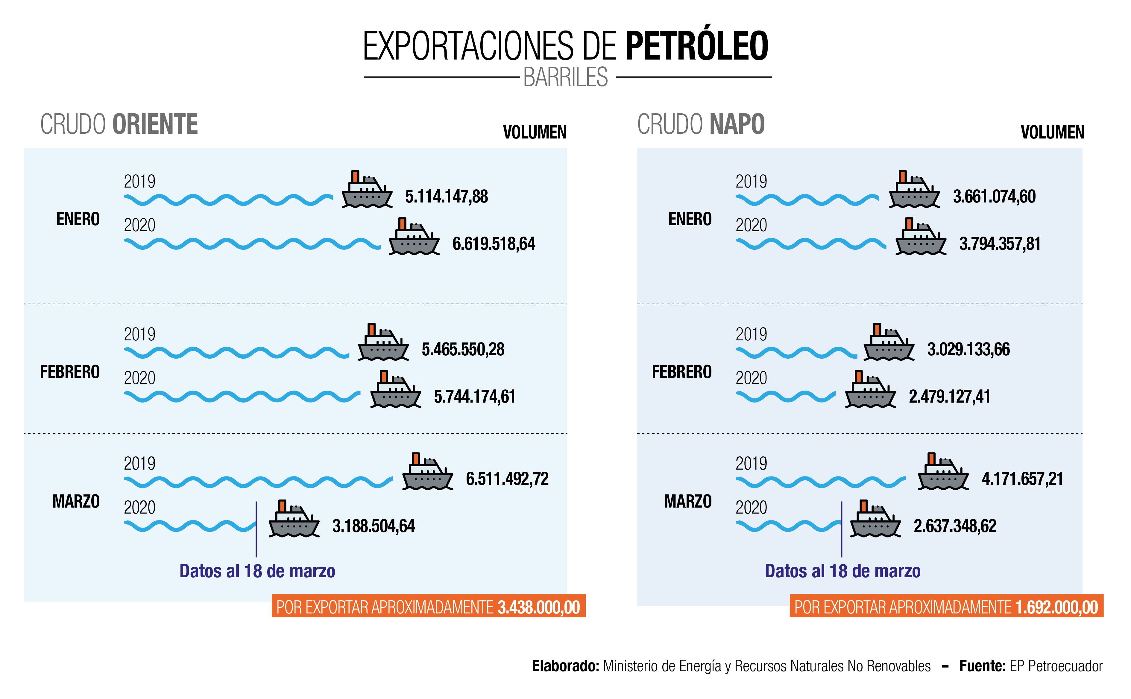 Ecuador mantiene sus exportaciones de petróleo. Según datos de EP Petroecuador, entre enero y el 18 de marzo de 2020, se han exportado 29,59 millones de barriles de petróleo; frente a 27,95 millones de barriles, exportados en 2019, durante el mismo periodo.