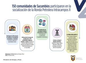 Entre abril a junio de 2022 se desarrolló la socialización de la Ronda Petrolera Intracampos II con la participaron de 8.495 personas, en cincuenta asambleas comunitarias y cinco reuniones con autoridades y dirigentes indígenas locales, de la provincia de Sucumbíos.