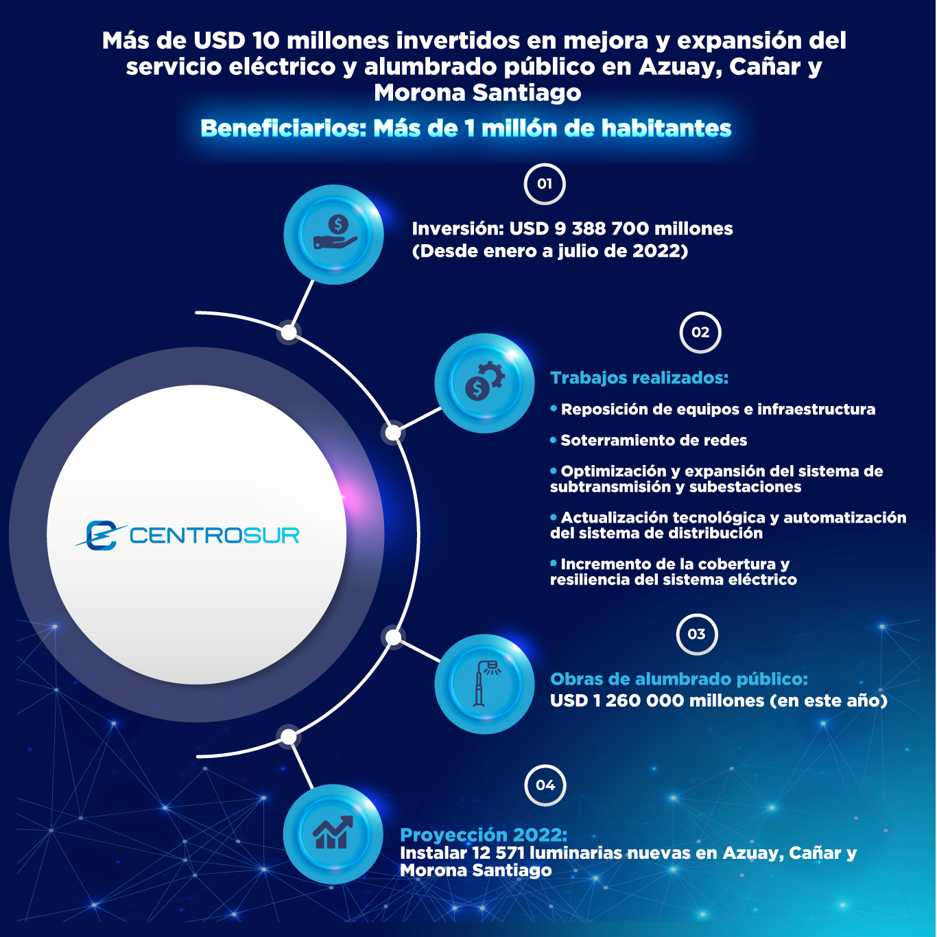 CentroSur ha impulsado obras de expansión de su servicio eléctrico, beneficiando a más de 1 millón de habitantes; la inversión realizada en estos aspectos, desde enero a julio de 2022, suma USD 9 388 700 millones. Entre los trabajos realizados están: reposición de equipos e infraestructura, soterramiento de redes, optimización y expansión del sistema de subtransmisión y subestaciones, actualización tecnológica y automatización de la operación del sistema de distribución, incremento de la cobertura y resiliencia del sistema eléctrico. Además, la empresa ha ejecutado obras para el servicio de alumbrado público; este año ha destinado un monto de USD 1 260 000 millones.