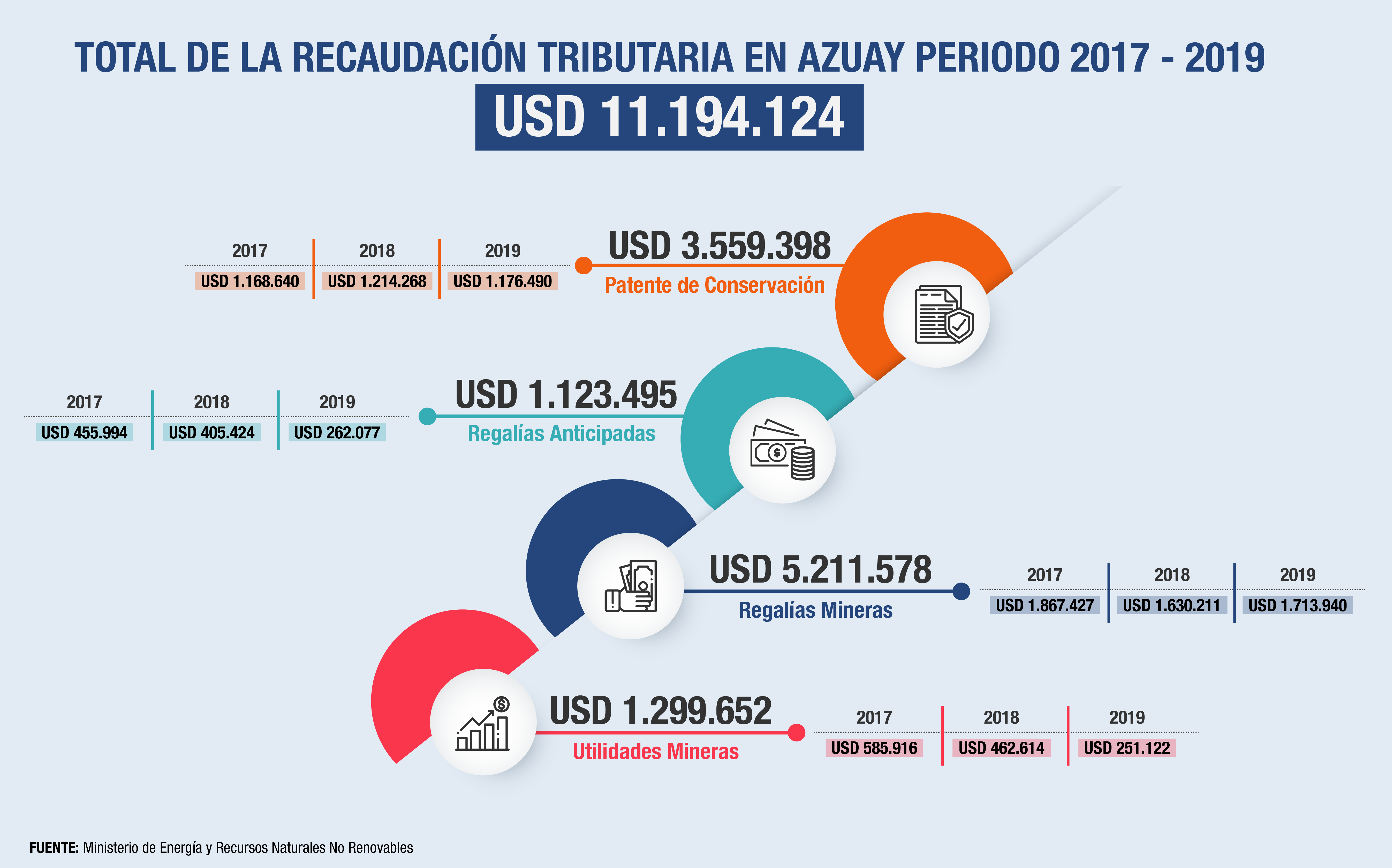 Entre enero de 2017 y diciembre de 2019, el Estado ecuatoriano recaudó USD 11.194.124 por concepto de patentes de conservación, regalías y utilidades provenientes de las actividades mineras que se desarrollan en la provincia del Azuay, principalmente de los cantones Camilo Ponce Enríquez y Cuenca.