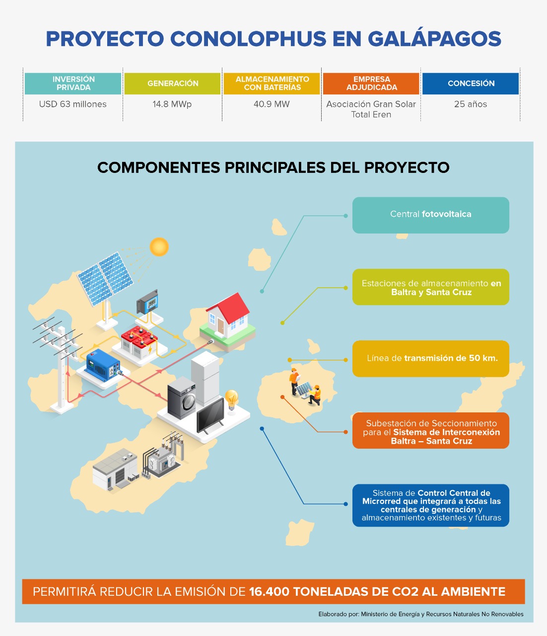 El Ministro de Energía y Recursos Naturales No Renovables, Juan Carlos Bermeo Calderón, señaló que: “el proyecto se ejecutará con una inversión de USD 63 millones, 100% capital privado, para la instalación de 14,8 MW de generación fotovoltaica con baterías de 40,9 MWh en las islas Santa Cruz y Baltra”.