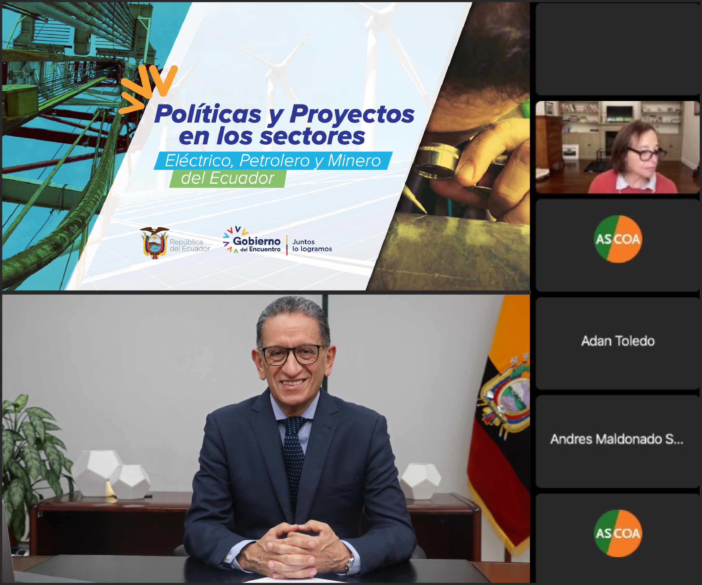 La positiva percepción internacional que ha generado la expedición de los Decretos Ejecutivos 95 y 151, que contienen tanto la nueva política petrolera como el plan de acción para la industria minera, que potencian el desarrollo del Ecuador, motivaron a que el Americas Society/Council of the Americas (AS/COA) desarrolle, este 15 de octubre de 2021, una reunión virtual con un grupo de ejecutivos de alto nivel de sus miembros corporativos, a fin de que los planes, programas y proyectos de los sectores minero, hidrocarburífero y eléctrico del Ecuador sean promocionados.