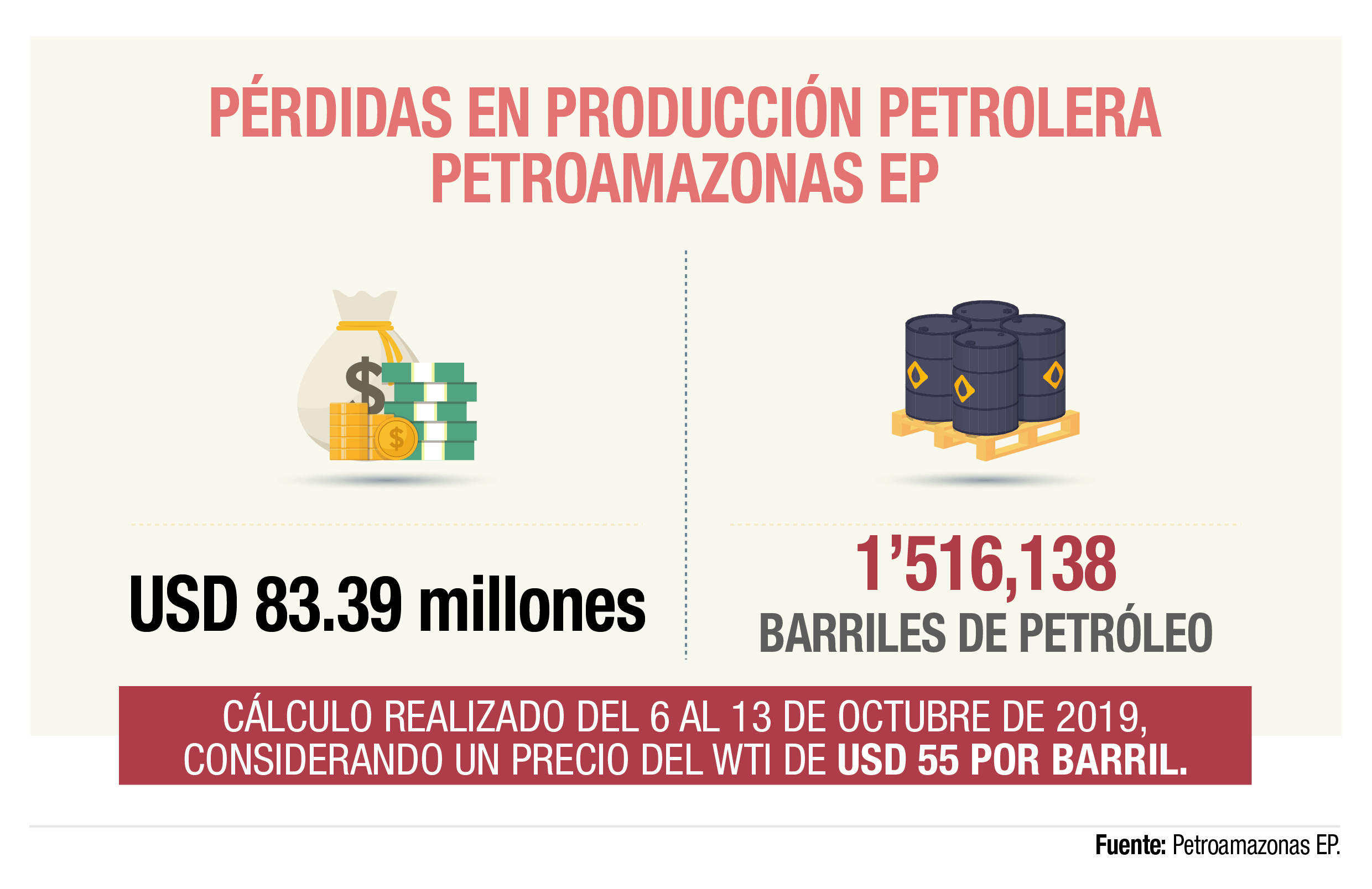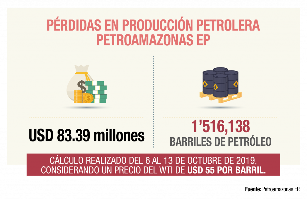 Respecto a la producción petrolera, Petroamazonas EP reportó hasta el 13 de octubre, una pérdida estimada de 1’516,138 barriles de petróleo acumulados. Así, el Estado ecuatoriano dejó de recibir USD 83.39 millones por concepto de ingresos petroleros, considerando un precio del WTI de USD 55 por barril.