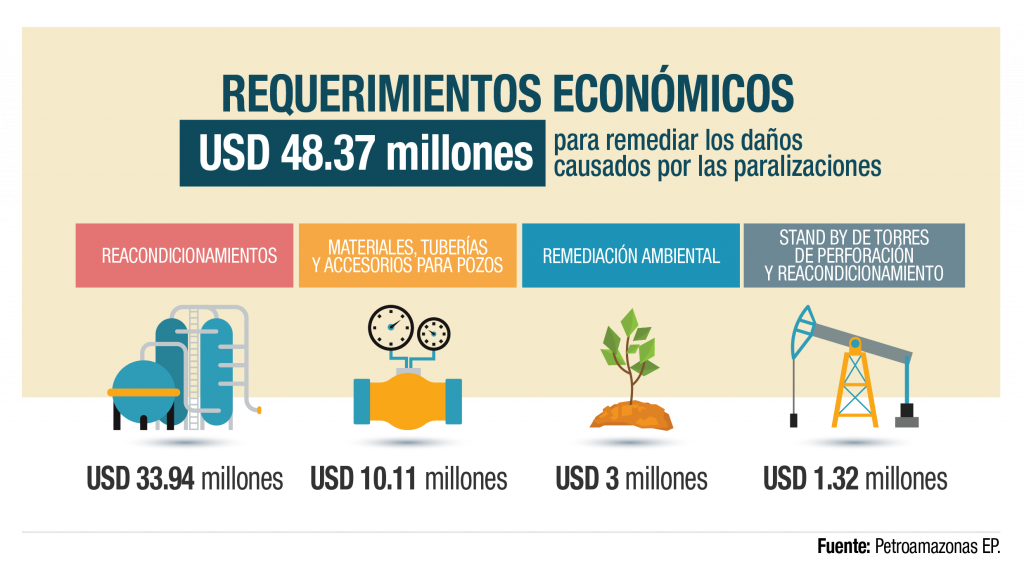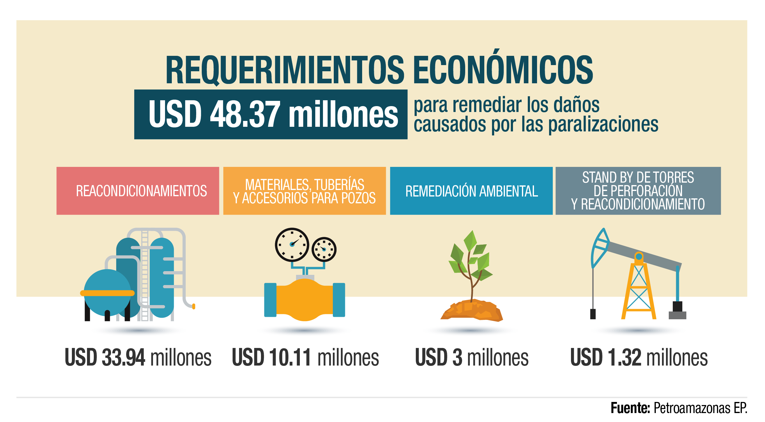 Aproximadamente USD 48,37 millones requerirá Petroamazonas EP para remediar los daños causados por la toma de varios campos de la petrolera, por parte de grupos ajenos a la operación. Este monto incluye: reacondicionamientos, materiales, tuberías, accesorios para pozos, remediación ambiental y stand by de torres de perforación.