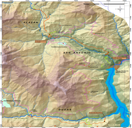 La Central San Antonio aprovecha los caudales del río Mazar, con una captación de rejilla de fondo ubicada aguas bajo de la casa de máquinas del Aprovechamiento Alazán, tiene una conducción de 4.1 km que incluye un túnel y cinco acueductos hasta llegar a casa de máquinas donde se aloja una unidad tipo Pelton.