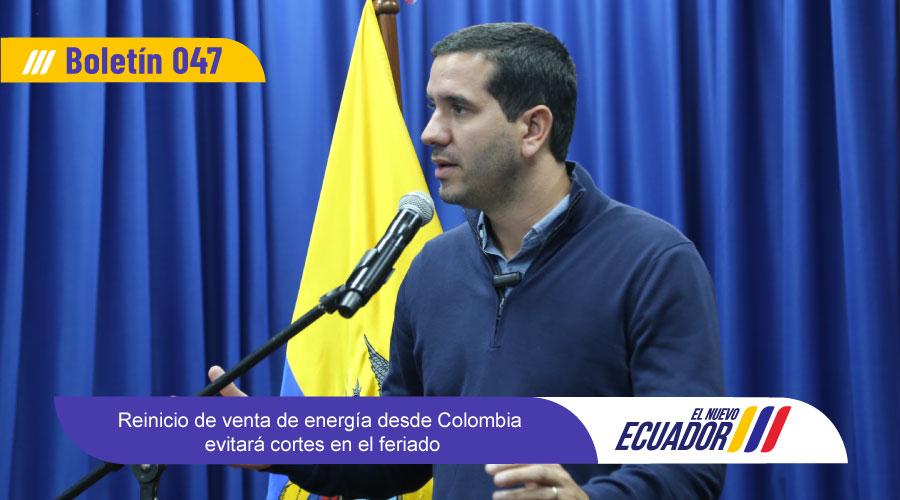 Este 29 de abril, en el marco de la séptima rueda de prensa donde se actualizó la situación eléctrica del Ecuador, el ministro de Energía y Minas ( e ), Roberto Luque, anunció que la interconexión con Colombia se ha reactivado, lo cual, implica que los cortes para los próximos días serán reducidos, así como estandarizados y la posibilidad de que no existan desconexiones a nivel nacional durante el feriado. El conversatorio se llevó a cabo en el Salón Azul de la Presidencia de la República.