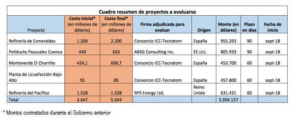 La evaluación técnica de cinco proyectos hidrocarburíferos, actualmente gestionados por EP Petroecuador, estará en manos de tres empresas internacionales especializadas, que fueron adjudicadas, mediante la suscripción de cinco contratos que suman alrededor de 3,3 millones de dólares, que permitirán un ahorro aproximado de cerca del 50% del monto estimado inicialmente para este proceso. Está previsto que los resultados de este proceso estén listos a partir de diciembre.