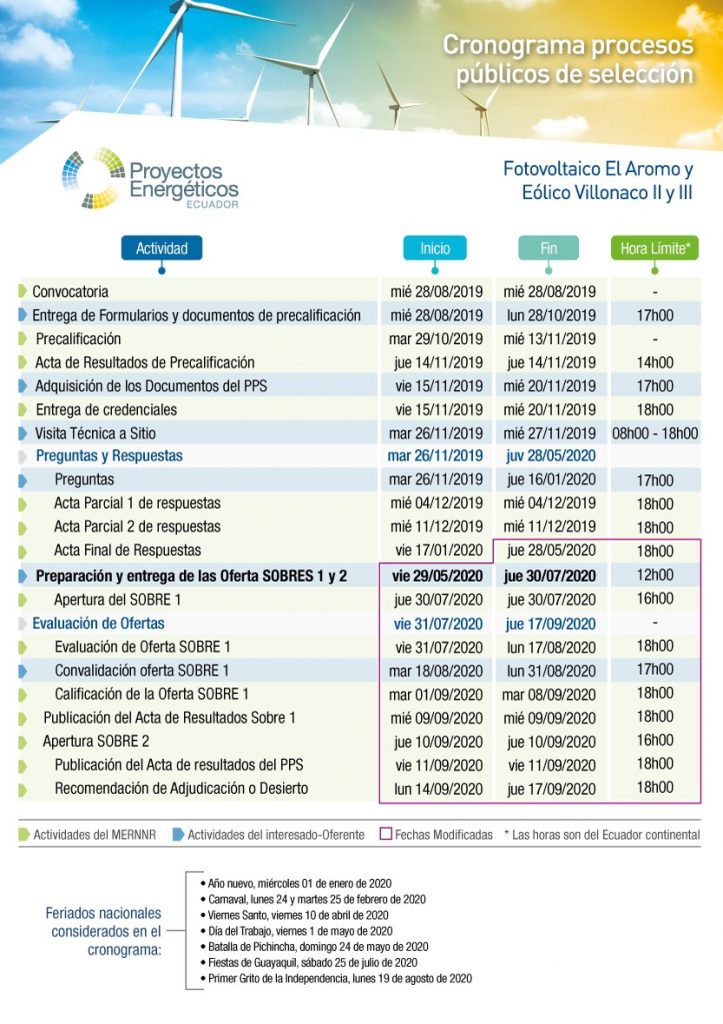 El Ministerio de Energía y Recursos Naturales No Renovables resolvió ampliar el plazo para la entrega de ofertas, dentro de los procesos públicos de selección para la concesión de los proyectos fotovoltaico El Aromo (de 200 megavatios) y eólico Villonaco II y III (de 110 megavatios), que se desarrollarán en las provincias de Manabí y Loja, respectivamente.
