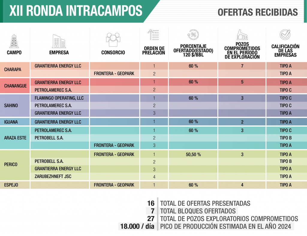 La Ronda Intracampos permitirá captar inversión para el desarrollo de siete bloques (Iguana, Perico, Arzá Este, Espejo, Sahino, Charapa y Chanangue), ubicados en la provincia de Sucumbíos.