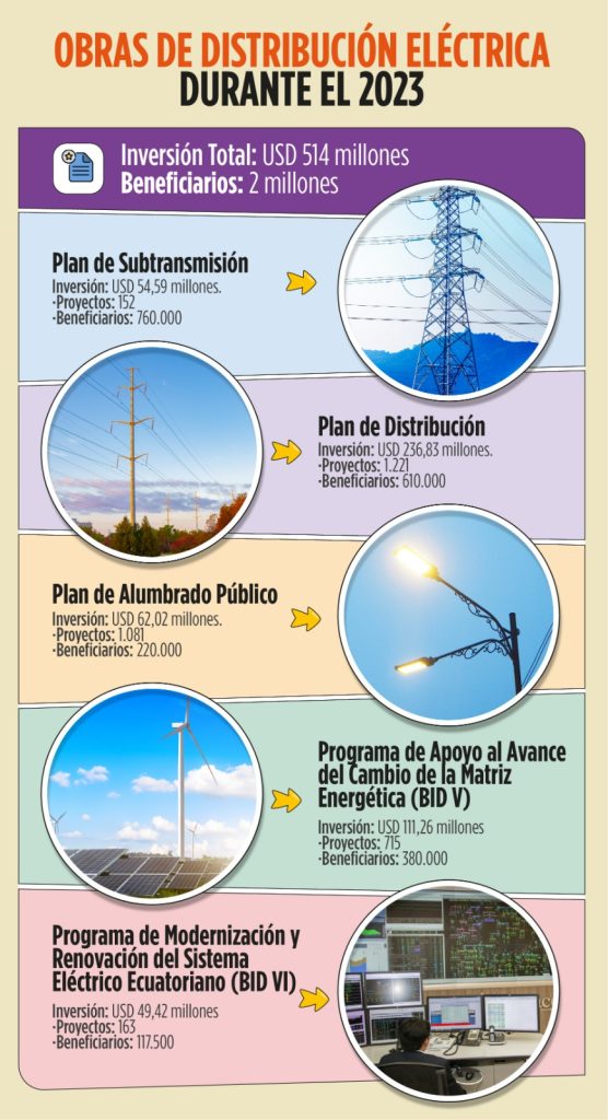 El Ministerio de Energía y Minas, a través de sus 10 empresas distribuidoras a escala nacional, invertirá USD 514 millones en obras de distribución eléctrica para el año 2023, beneficiando de esta manera a 2 millones de ecuatorianos, a través de planes y programas enfocados al mejoramiento de la calidad de servicio, expansión del sistema eléctrico y la modernización de infraestructura que contribuyen con la confiabilidad, continuidad e incremento de la capacidad instalada del sistema eléctrico del país.