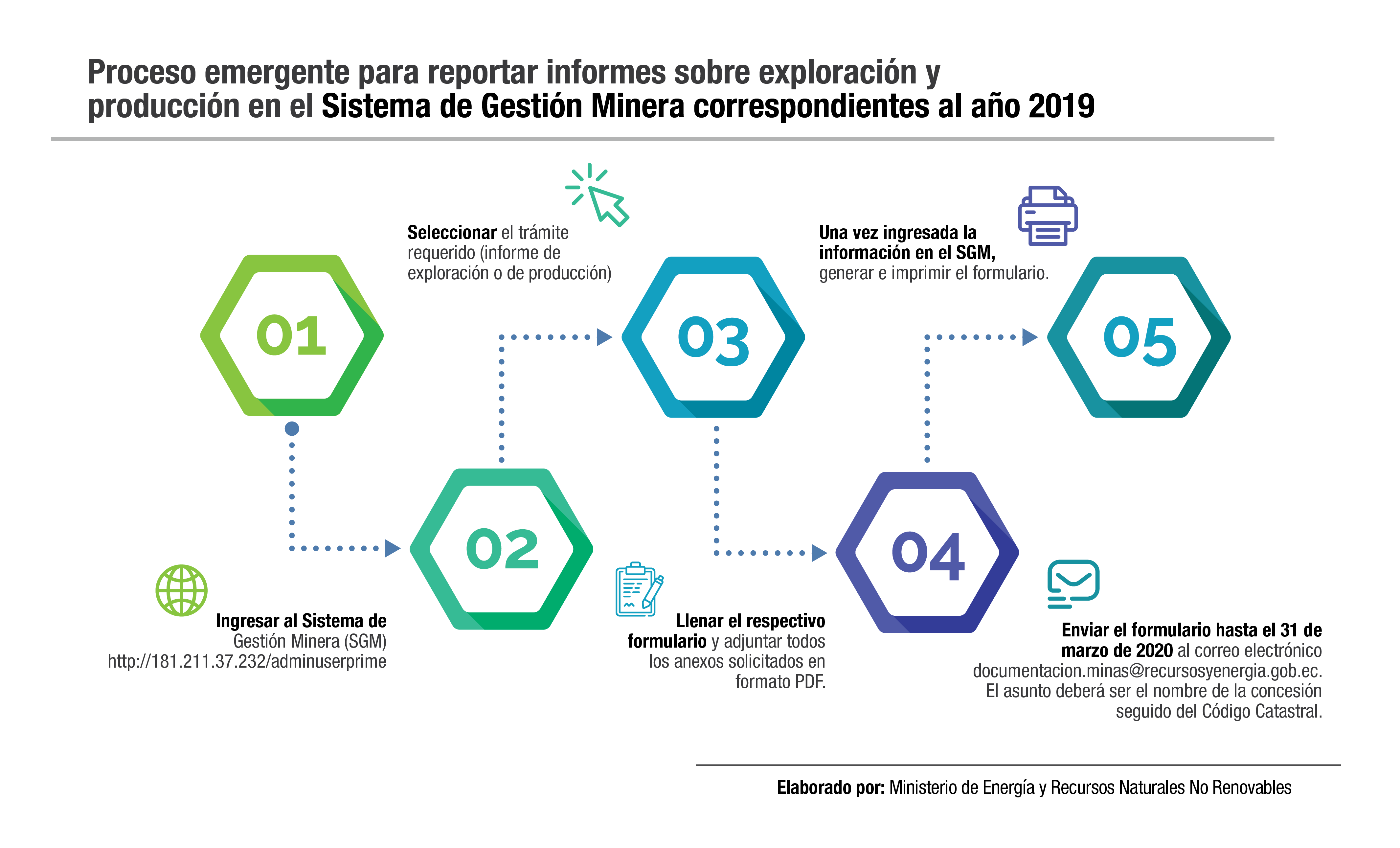 Este 19 de marzo de 2020, el Viceministerio de Minas emitió la Circular Nro. MERNNR-VM-2020-0002-CIR para informar a los titulares mineros que, debido a la emergencia sanitaria que está atravesando el Ecuador por la propagación del Covid-19, se pospone la presentación física de los informes de exploración y producción minera.